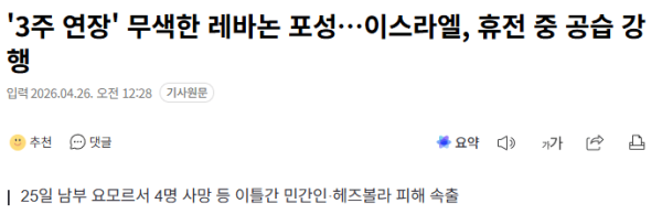 이스라엘 정권 군은 레바논 남부의 데이르 알-자하라니(Deir al-Zahrani)와 크파르 르만(Kfarsir) 인근 지역을 타격했음을 인정했습니다.