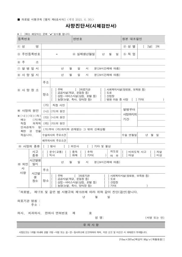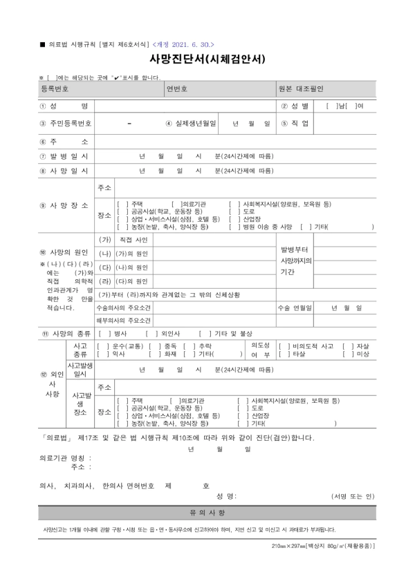 사망 원인이 명확하지 않거나 사고사,외인사,기타 및 불상으로 적히면 경찰 신고와 검시 절차가 필요할 수 있습니다