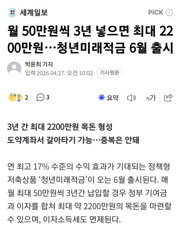 3년 간 최대 2200만원 목돈 형성 도약계좌서 갈아타기 가능…중복은 안돼 연 최고 17% 수준의 수익 효과가 기대되는 정책형 저축상품 ‘청년미래적금’이 오는 6월 출시된다. 매월 최대 50만원씩 3년간 납입할 경우