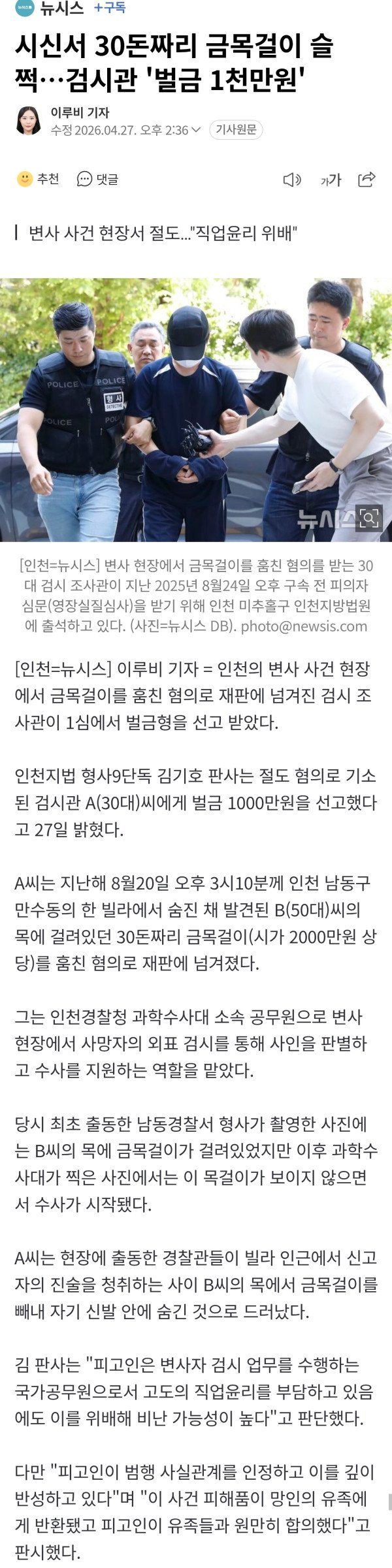 인천의 변사 사건 현장에서 금목걸이를 훔친 혐의로 재판에 넘겨진 검시 조사관이 1심에서 벌금형을 선고 받았다. 인천지법 형사9단독 김기호 판사는 절도 혐의로 기소된 검시관 A(30대)씨에게 벌금 1000만원을 선고했