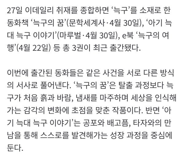 대전 오월드에서 탈출한 늑대 ‘늑구’ 이야기가 단 3주 만에 책으로 나왔다. 지난 4월 8일 오전 9시 18분 탈출 사건이 발생한 뒤 불과 22일 만에 이를 소재로 한 동화책 3권이 잇따라 출간된 것이다. 통상 한