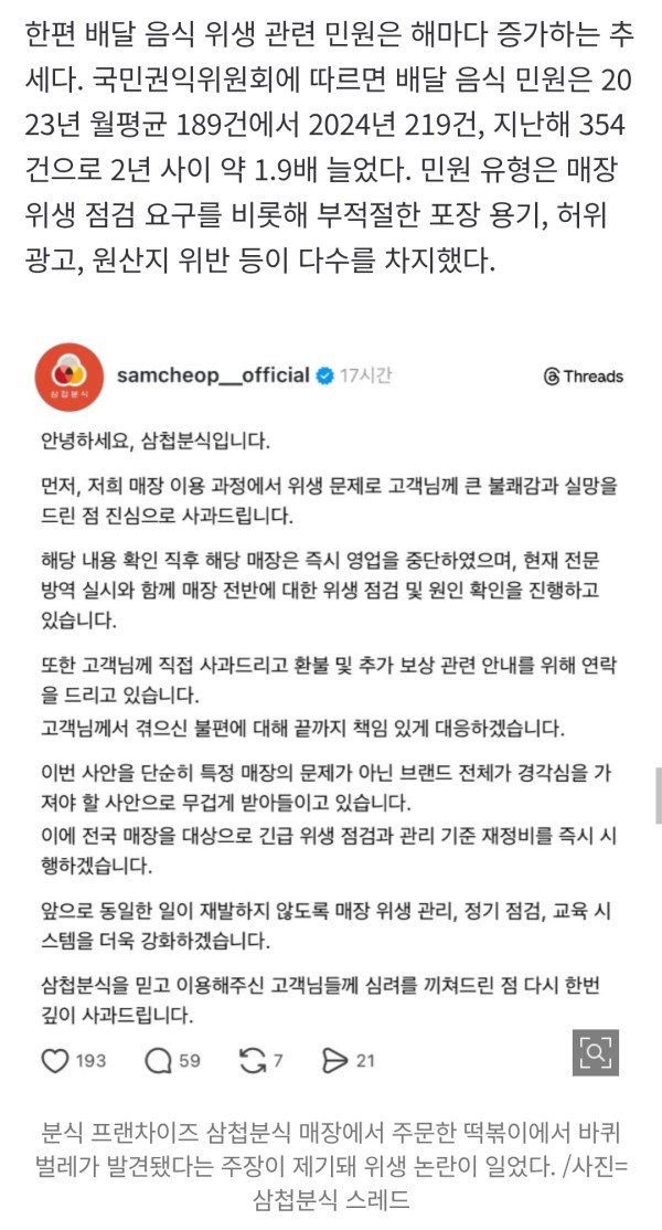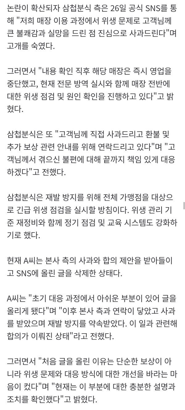 분식 프랜차이즈 삼첩분식 매장에 주문해 받은 떡볶이에서 바퀴벌레가 발견됐다는 주장이 나와 위생 논란이 일었다. 삼첩분식 측은 해당 매장의 영업을 즉시 중단하고 방역 및 위생 점검을 진행 중이라는 입장을 밝혔다. 지난