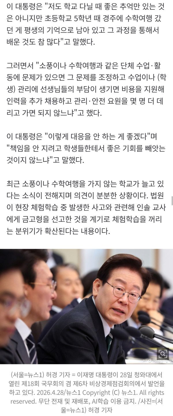 이재명 대통령이 일부 학교의 소풍 및 수학여행 기피 현상과 관련해 "자주 말씀드리는데 구더기가 생기지 않을까 싶어 장독을 없애버리면 안 된다"고 밝혔다. 이 대통령은 28일 청와대에서 열린 국무회의 겸 비상경제점검회