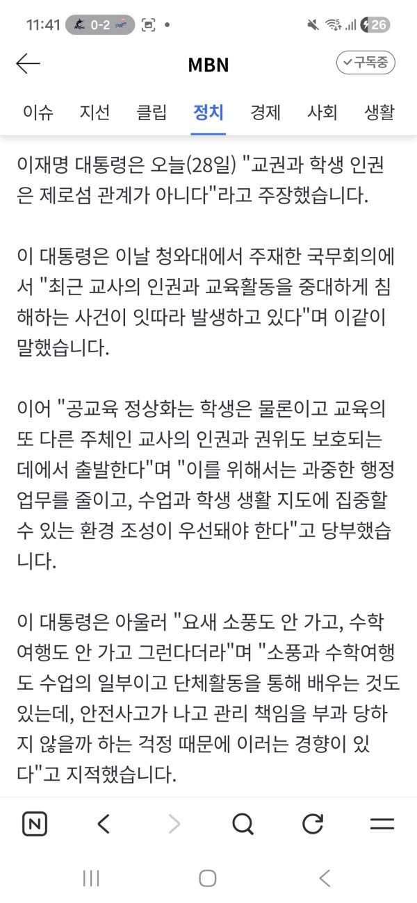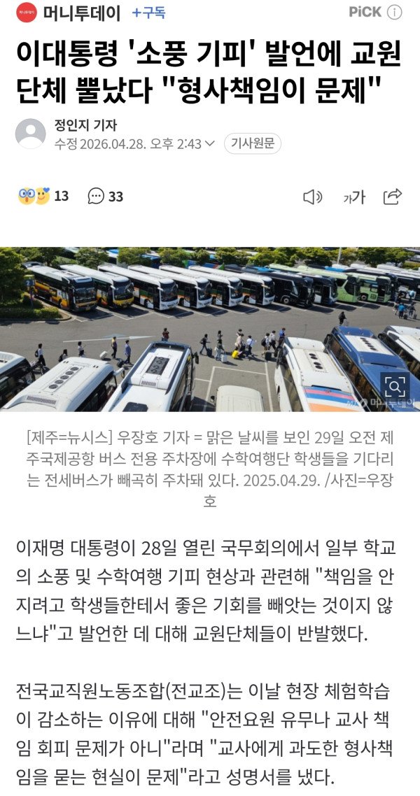 이재명 대통령이 28일 열린 국무회의에서 일부 학교의 소풍 및 수학여행 기피 현상과 관련해 "책임을 안 지려고 학생들한테서 좋은 기회를 빼앗는 것이지 않느냐"고 발언한 데 대해 교원단체들이 반발했다. 전국교직원노동조