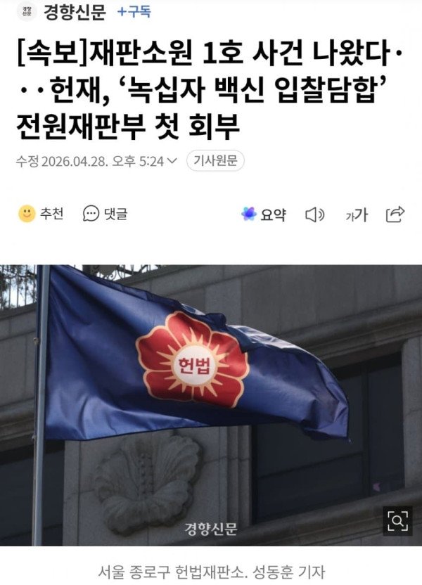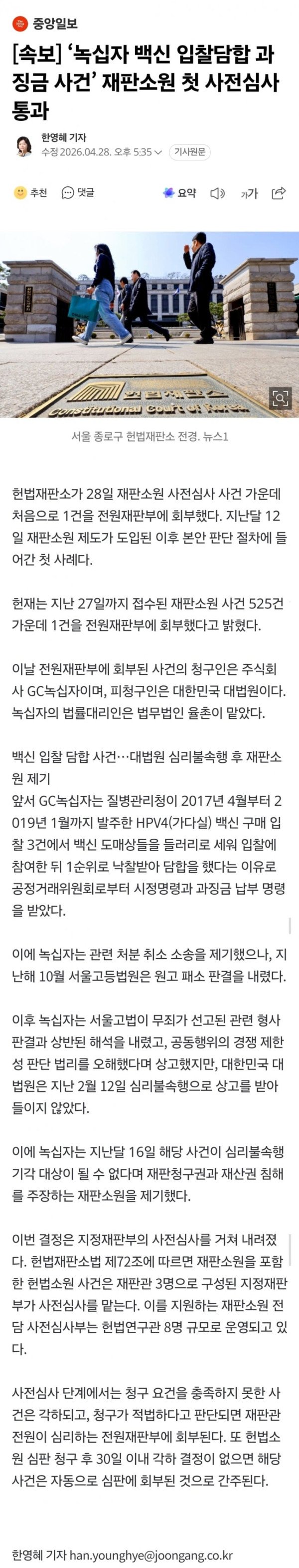 헌법재판소가 녹십자 백신 입찰담합 과징금 사건을 재판소원 1호 사건으로 전원재판부에 올렸다. 헌재는 28일 재판소원 시행 뒤 처음으로 녹십자 백신 입찰담합 과징금 사건을 전원재판부에 회부하기로 결정했다고 밝혔다. 헌