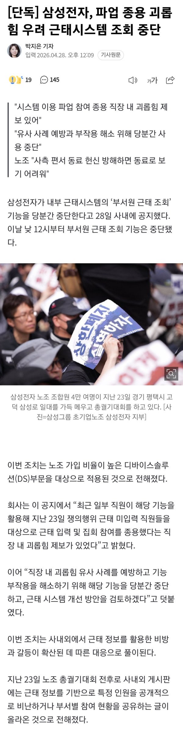 실시간 삼성전자 부서원 근태 조회 기능 삭제 (파업 결속력 방지?)