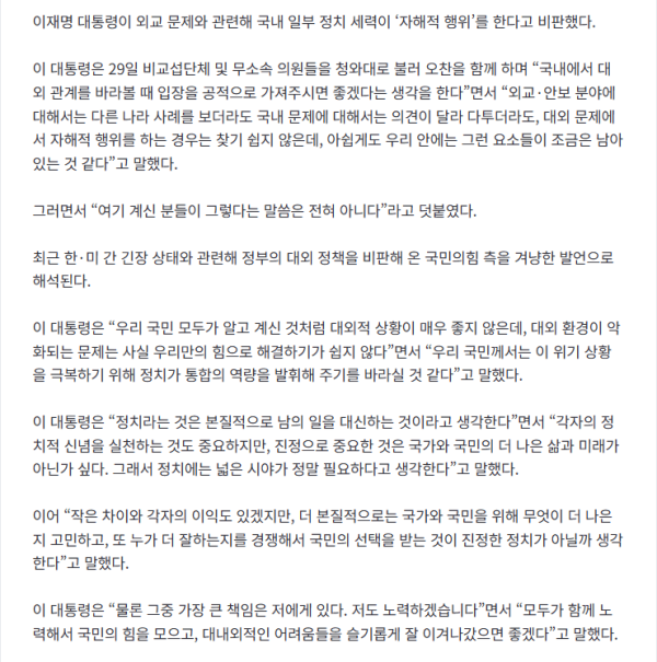 이재명 대통령이 외교 문제와 관련해 국내 일부 정치 세력이 ‘자해적 행위’를 한다고 비판했다. 이 대통령은 29일 비교섭단체 및 무소속 의원들을 청와대로 불러 오찬을 함께 하며 “국내에서 대외 관계를 바라볼 때 입장