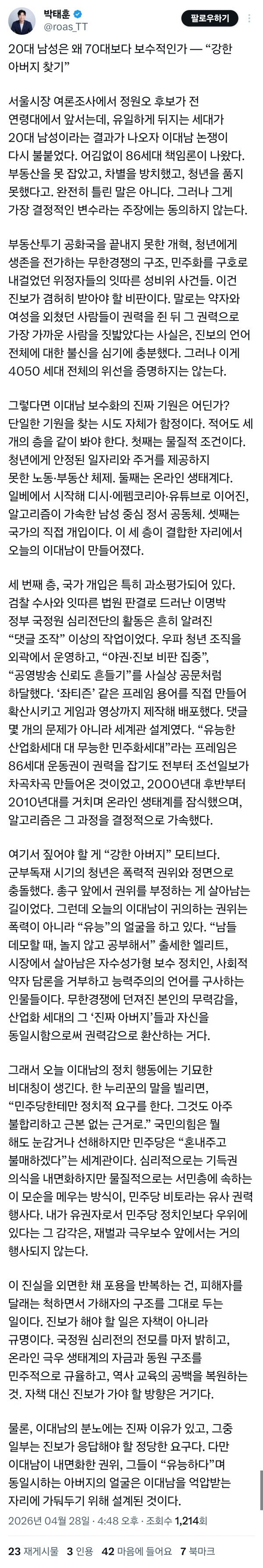 20대 남성은 왜 70대보다 보수적인가 — “강한 아버지 찾기”