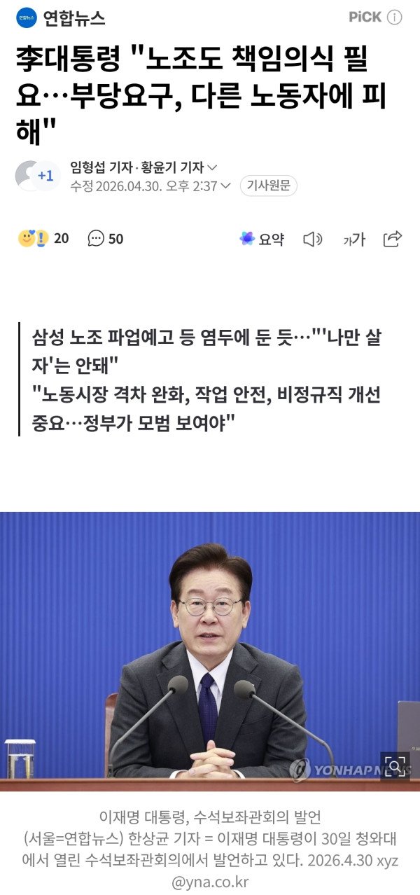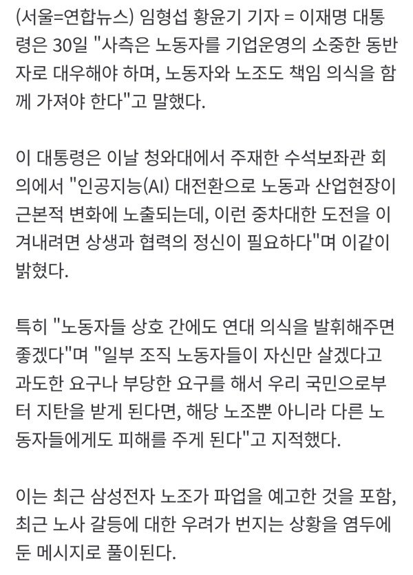 삼성 노조 파업예고 등 염두에 둔 듯…"'나만 살자'는 안돼" "노동시장 격차 완화, 작업 안전, 비정규직 개선 중요…정부가 모범 보여야" 임형섭 황윤기 기자 = 이재명 대통령은 30일 "사측은 노동자를 기업운영의