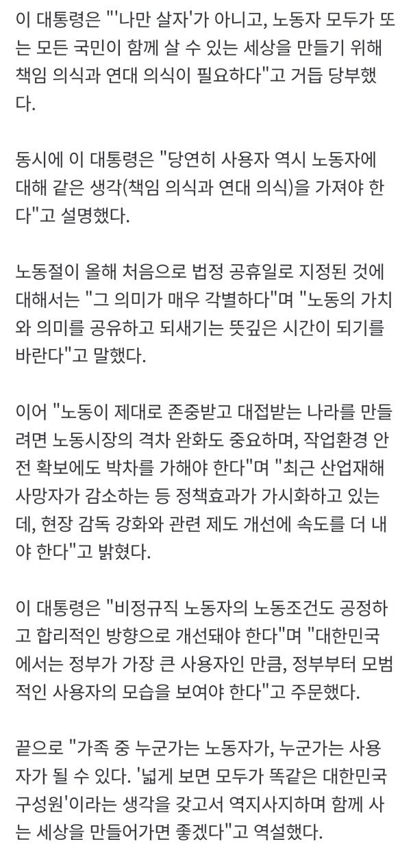 李대통령 "노조도 책임의식 필요…부당요구, 다른 노동자에 피해"