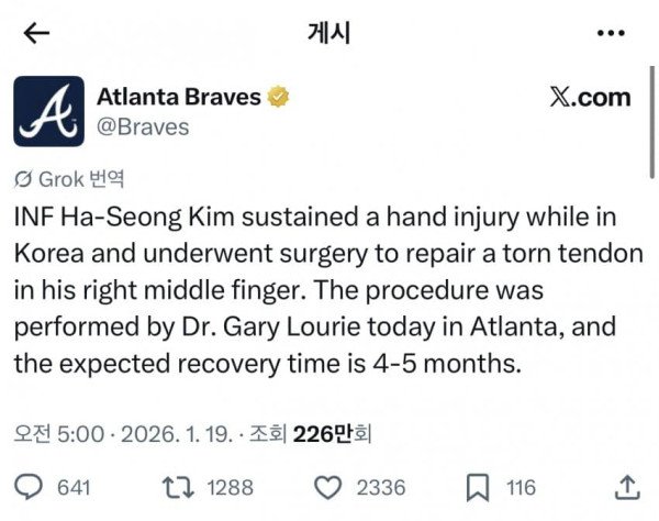 속보 김하성 빙판길에서 넘어져 손가락 부상, 전치 4~5개월