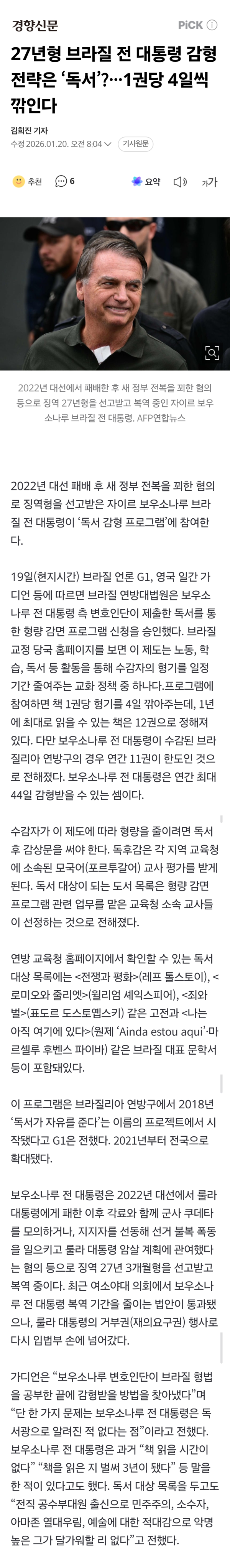 27년형 받은 보우소나루 감형 전략은 ‘독서’? 1권당 4일씩 깎인