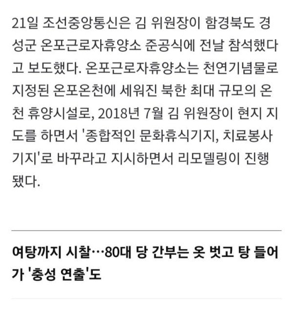 김정은 북한 국무위원장이 과거 운영 실태를 신랄하게 질타했던 온천 휴양시설을 다시 찾아 리모델링 성과를 칭찬했다. 개선을 지시한 뒤 이를 잘 이행한 단위는 칭찬하는 모습을 보이면서 관료사회의 긴장감을 유지하고 기강을