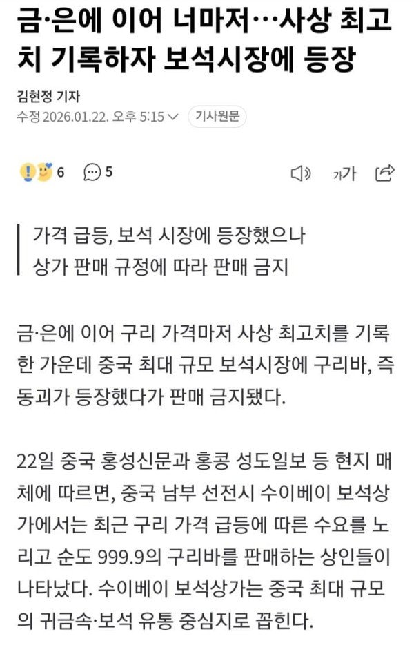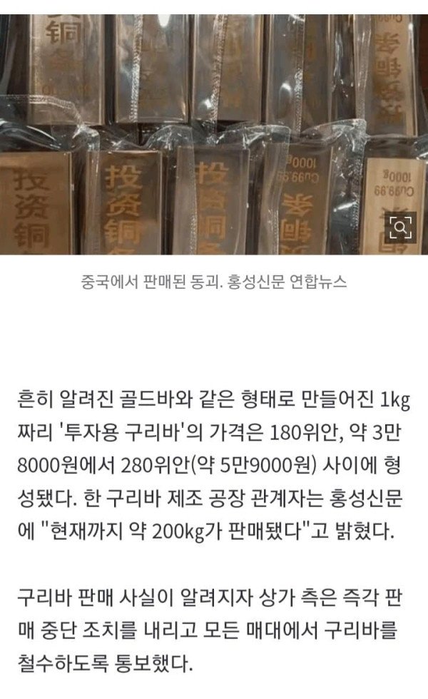금·은에 이어 구리 가격마저 사상 최고치를 기록한 가운데 중국 최대 규모 보석시장에 구리바, 즉 동괴가 등장했다가 판매 금지됐다. 22일 중국 홍성신문과 홍콩 성도일보 등 현지 매체에 따르면, 중국 남부 선전시 수이