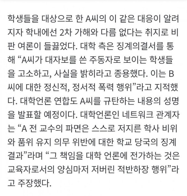 • 학생들에 대한 교수의 법적 대응은 2차 가해라는 비판을 받고 있으며, 대학언론 연합은 교수의 행위를 교육자로서 양심을 저버린 적반하장 행위라고 규탄했다.