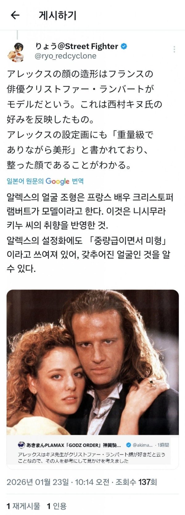 키누 여사가 크리스토퍼 램버트 팬이라
