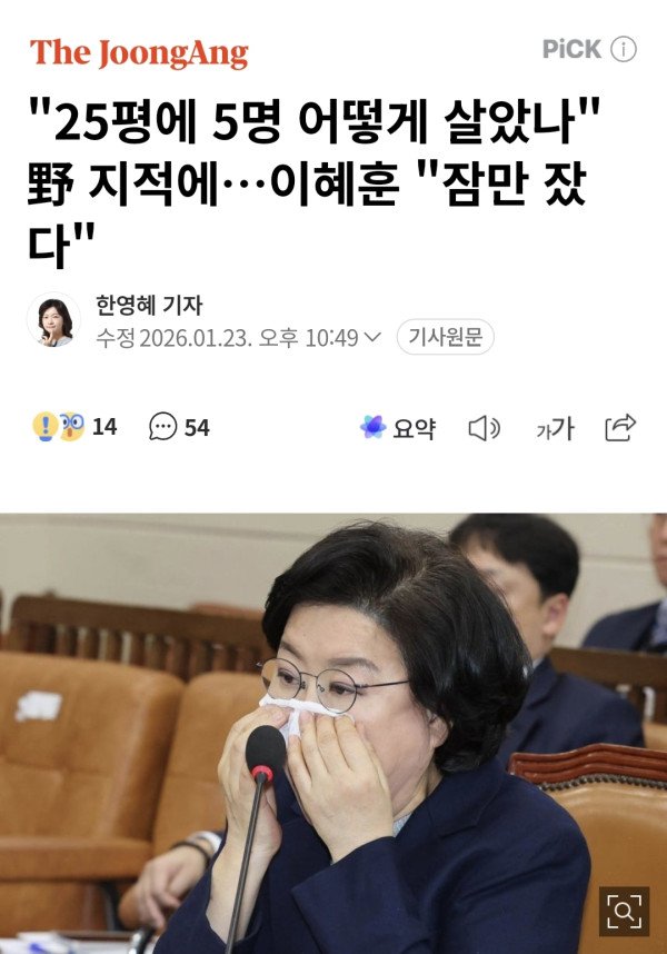 "25평에 5명 어떻게 살았나" 野 지적에…이혜훈 "잠만 잤다"