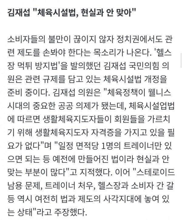 • 현행 국민체육진흥법상 생활스포츠지도사 자격증이 공인 자격증이지만, 헬스장 개업과 달리 활동하는 트레이너는 자격증 없이도 가능한 구조이며, 과태료 규정 역시 미미하여 비전문가의 활동을 막기 어렵다.