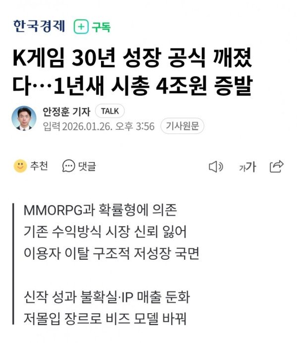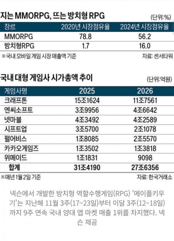• 국내 주요 게임사들의 시가총액이 1년 새 약 4조원 감소하며 한국 게임 산업이 구조적 저성장 국면에 진입했다는 분석이 나오고 있다.