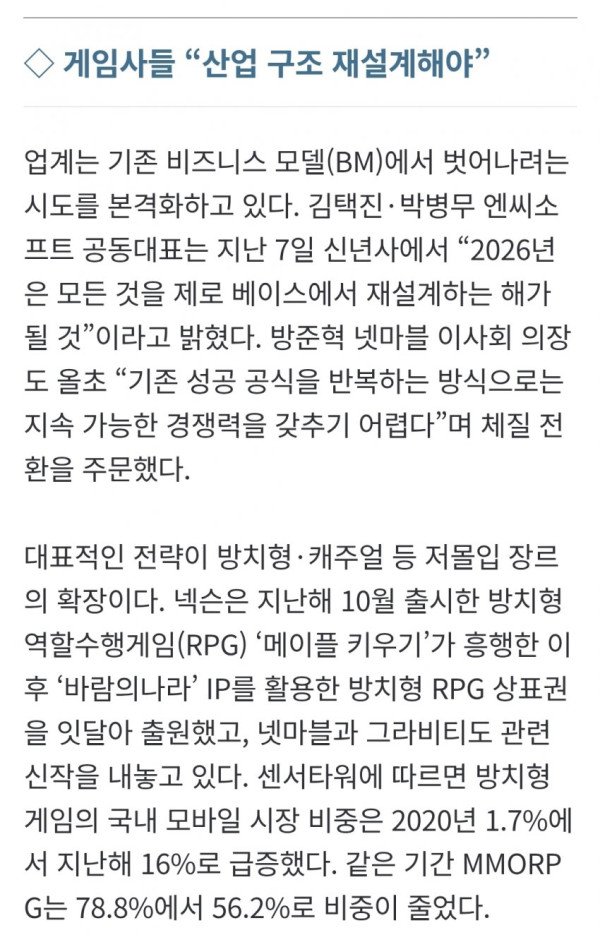 • 이에 게임사들은 방치형, 캐주얼 등 저몰입 장르로 비즈니스 모델을 전환하려는 시도를 본격화하고 있으나, 이는 시장 확대보다는 축소되는 시장에서 손익을 방어하기 위한 대응이라는 평가도 있다.