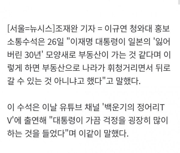 • 이규연 청와대 홍보소통수석은 이재명 대통령이 부동산 문제로 인해 한국이 일본의 '잃어버린 30년'과 같은 경제 침체를 겪을 수 있다는 깊은 우려를 표했다고 밝혔다.