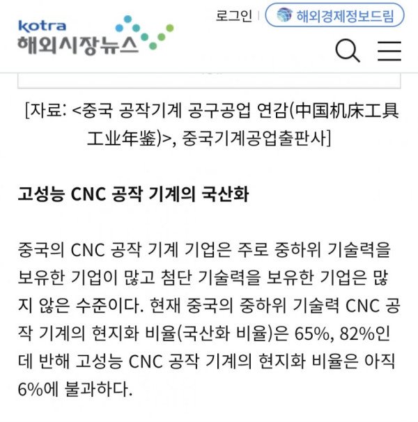 실제로 중국 공장을 돌리는 자동화 시스템 구성요소중에서 cnc같은 공작기계나 plc같은 기계작동 제어기 국산화율은 상당히 낮다