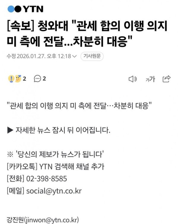 청와대는 도널드 트럼프 미국 대통령이 한국에 대한 관세를 25%로 재인상하겠다고 언급한 데 대해 "정부는 관세합의 이행 의지를 미국 측에 전달하는 한편 차분히 대응해나갈 계획"이라고 강조했다. 강유정 청와대 대변인은