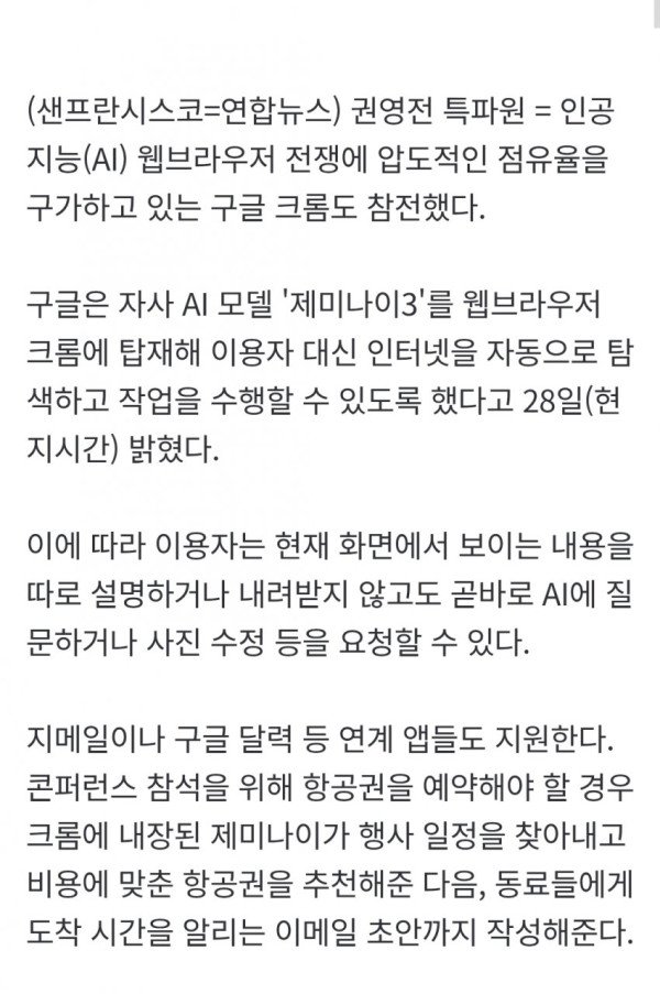 • 구글이 AI 모델 '제미나이3'를 웹브라우저 크롬에 탑재하여 이용자 대신 인터넷을 자동으로 탐색하고 작업을 수행하는 기능을 선보였다.