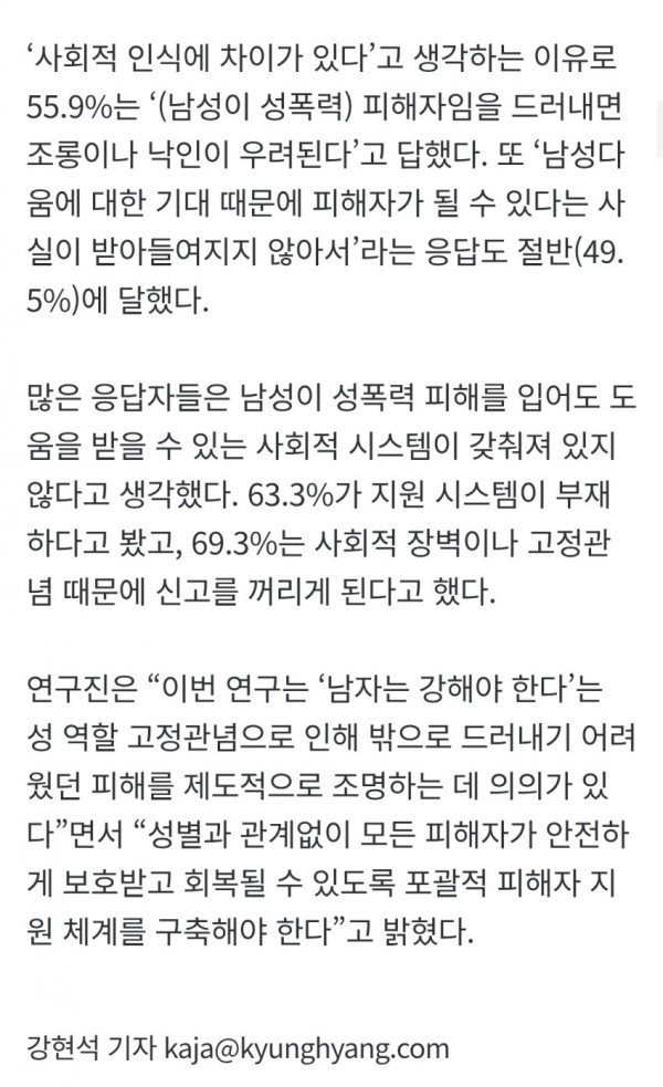 • 연구진은 '남자는 강해야 한다'는 성 역할 고정관념 때문에 피해 사실을 드러내기 어려운 남성들의 현실을 조명하며, 성별과 관계없이 모든 피해자가 안전하게 보호받을 수 있는 포괄적인 지원 체계 구축의 필요성을 강조했다.