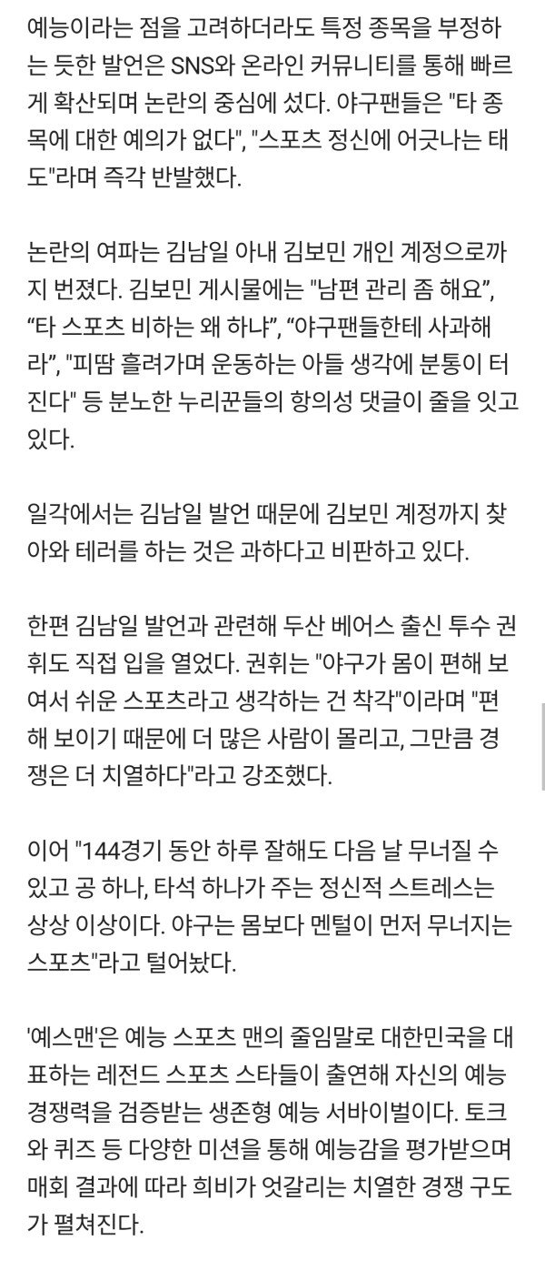 김보민은 무슨 죄? 김남일 "야구 스포츠 아냐" 망언에 SNS 테러