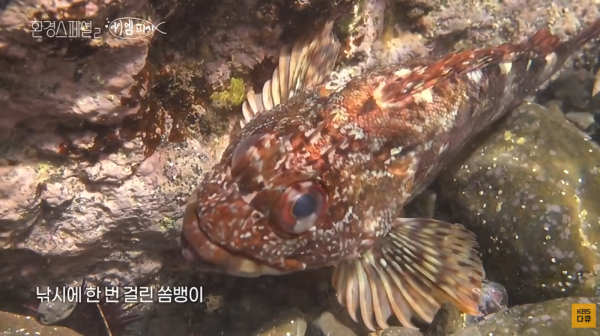 낚시 첫트에 바로 미끼를 물어버린 쏨뱅이.
