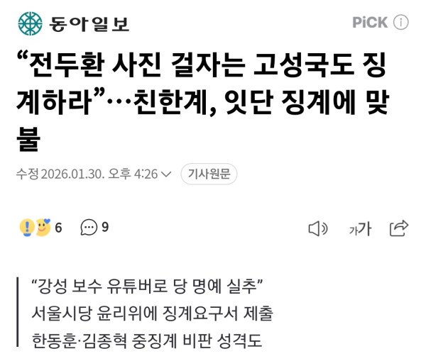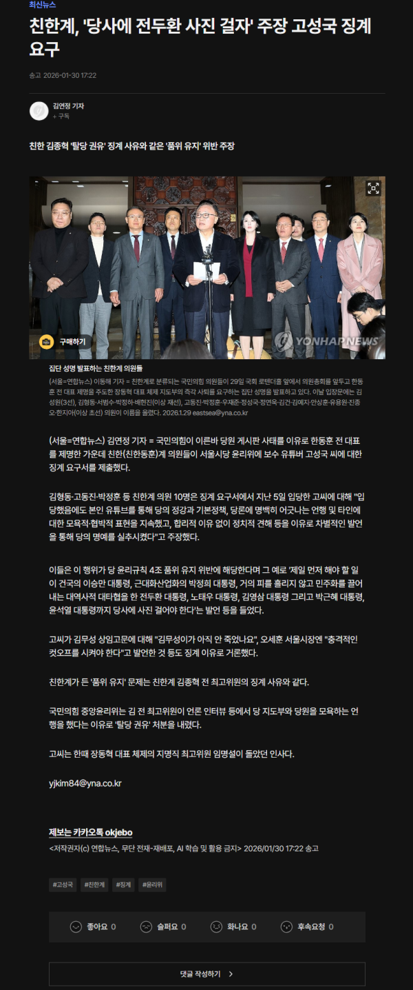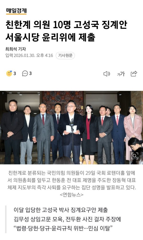 친한(친한동훈)계 국민의힘 의원들은 30일 장동혁 대표의 12·3 비상계엄 사과 하루 전날 당에 입당한 강성 보수 성향 유튜버 고성국 씨가 당의 명예를 실추시키는 발언을 했다며 서울시당 윤리위원회에 징계를 요구했다.