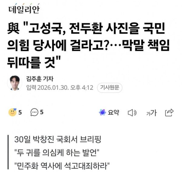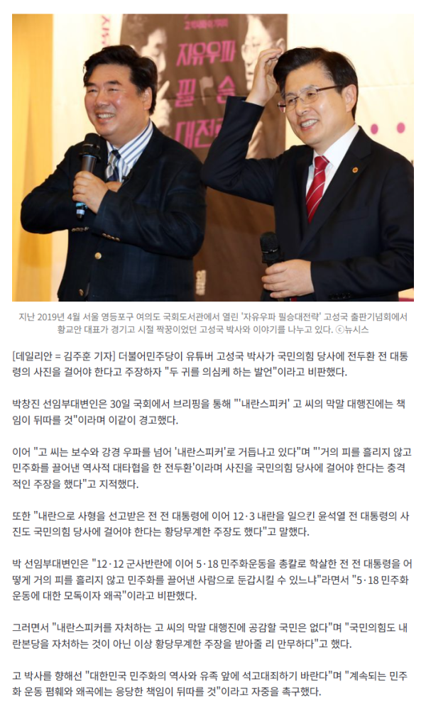 더불어민주당이 유튜버 고성국 박사가 국민의힘 당사에 전두환 전 대통령의 사진을 걸어야 한다고 주장하자 "두 귀를 의심케 하는 발언"이라고 비판했다. 박창진 선임부대변인은 30일 국회에서 브리핑을 통해 "'내란스피커'