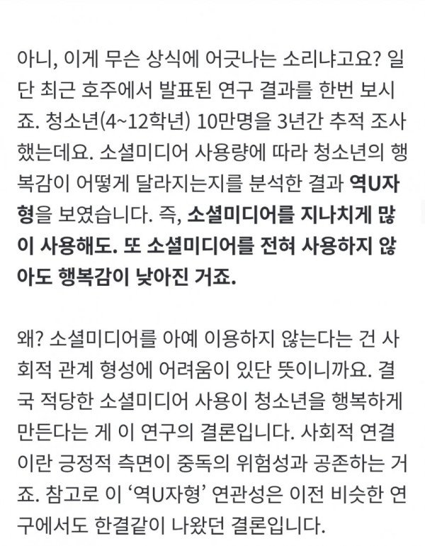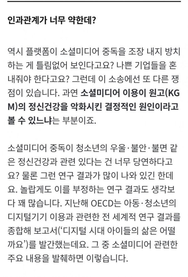 • 그러나 소셜미디어 이용이 정신 건강 악화의 결정적인 원인인지에 대한 인과관계가 약하다는 반론도 제기되고 있으며, OECD 보고서와 호주 연구 등은 디지털 기술 사용과 행복 사이에 단일하고 선형적인 관계가 없음을 시사한다.