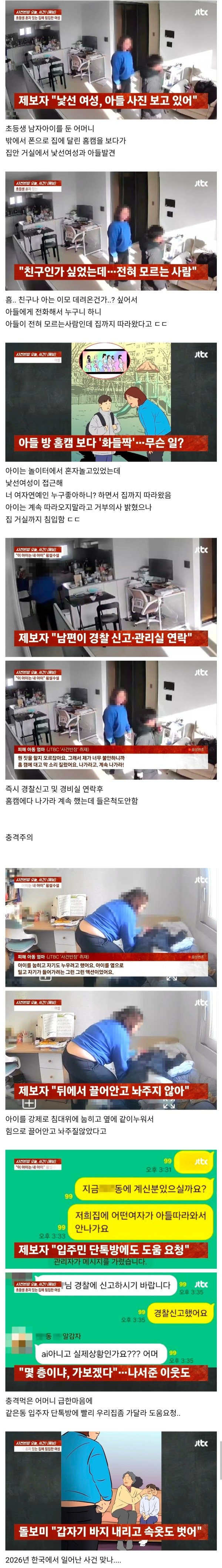남의 집에 무단침입해서 초딩 남자애 끌어안고 내 애라면서 정신나간 소리하다가 경찰에 잡힘