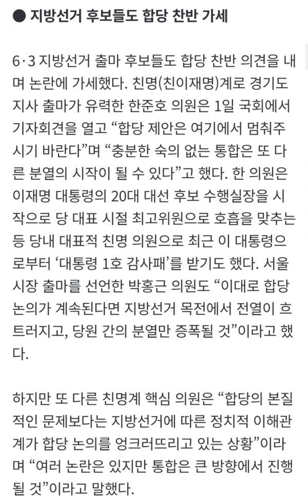 • 이러한 가운데 지방선거 출마 후보들도 합당 찬반 의견을 내며 논란에 가세했으며, 민주당은 이번 주부터 당원 의견 수렴 및 투표 절차를 진행할 예정이다.