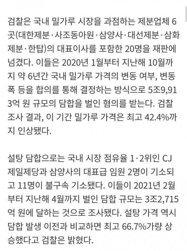 • 검찰 조사 결과, 제분업체 6곳은 약 6년간 5조 9,913억 원 규모의 밀가루 가격 담합을 통해 최고 42.4%까지 가격을 인상했으며, CJ제일제당과 삼양사 등은 3조 2,715억 원 규모의 설탕 가격 담합으로 최고 66.7%까지 가격을 상승시킨 혐의를 받고 있다.