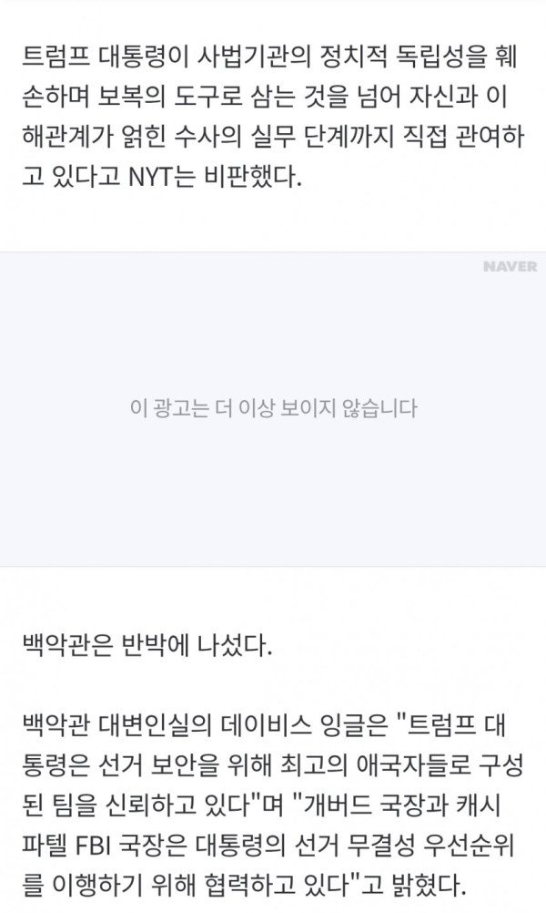 • 이번 사안은 현직 대통령이 정치적으로 민감하고 개인적 이해관계가 얽힌 수사에 직접 관여하고, 정보기관 총괄 수장이 업무 범위를 넘어 FBI 수사에 개입했다는 점에서 이례적이며, NYT는 대통령이 법무부나 FBI 수뇌부를 건너뛰고 일선 수사관들과 직접 접촉한 것은 사법기관의 정치적 독립성을 훼손할 수 있다고 비판했다.