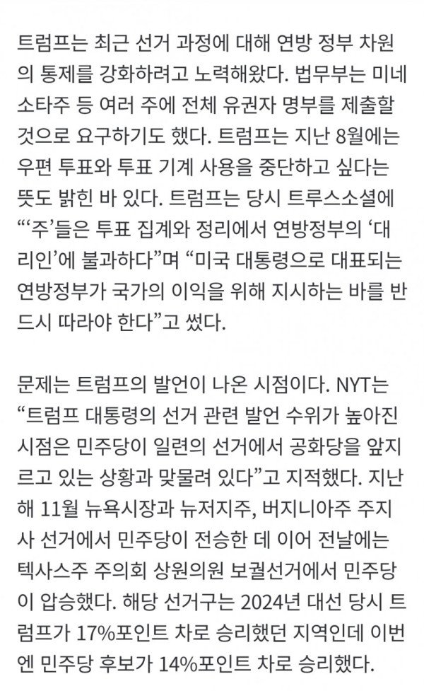 • 도널드 트럼프 전 미국 대통령은 최근 공화당의 연이은 선거 참패와 맞물려 미국의 선거 제도를 연방정부 통제 하에 두는 '국가화'를 주장하며, 최소 15개 주의 투표를 공화당이 장악해야 한다고 말했다.
