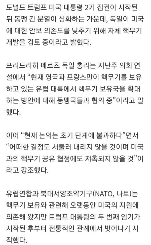 도널드 트럼프 미국 대통령 2기 집권이 시작된 뒤 동맹 간 분열이 심화하는 가운데, 독일이 미국에 대한 안보 의존도를 낮추기 위해 자체 핵무기 개발을 검토 중이라고 밝혔다. 프리드리히 메르츠 독일 총리는 지난주 의회
