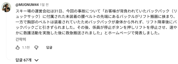 스키장 운영사는 31일 이번 사고에 대해 “고객이 메고 있던 백팩에 부착된 미착용 허리 벨트 끝부분의 버클이 리프트에 끼였고, 가슴 벨트는 착용 중이어서 백팩이 몸에서 벗겨지지 않아 리프트 하차 후 백팩과 함께 끌려갔습니다. 이후 직원이 정지 버튼을 눌러 리프트를 멈추고 신속히 구조 활동을 실시한 뒤 구급차로 이송되었습니다”라고 홈페이지에서 발표했습니다.