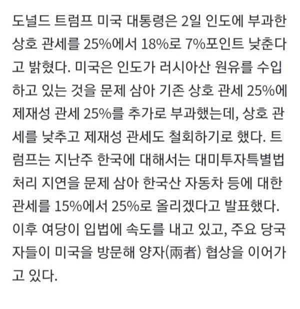 3일 한미 외교장관 회담… 팩트시트 후속 논의 도널드 트럼프 미국 대통령은 2일 인도에 부과한 상호 관세를 25%에서 18%로 7%포인트 낮춘다고 밝혔다. 미국은 인도가 러시아산 원유를 수입하고 있는 것을 문제 삼아