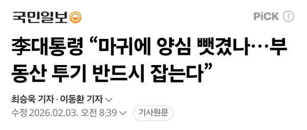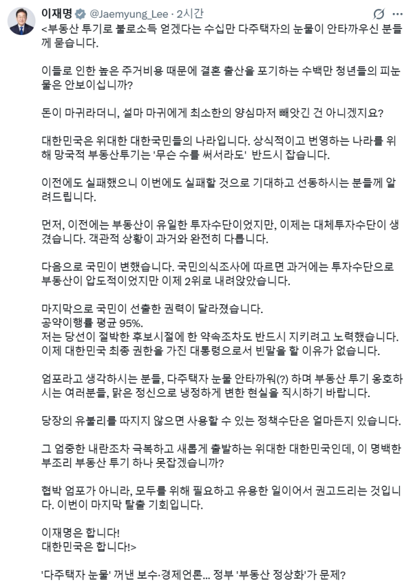 "망국적 부동산 투기, 무슨 수를 써서라도 잡겠다" "불로소득 얻겠단 다주택자, 청년 눈물 안 보이나" "내란 극복한 대한민국, 부동산 투기 못 잡겠나" "이제는 대체 투자수단 생겨…과거와 상황 달라" "협박 아닌
