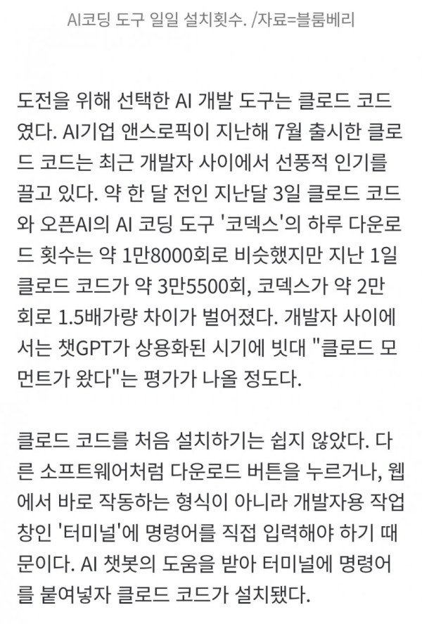 • 클로드 코드 설치 과정은 MS-DOS를 연상시키는 터미널 환경에서 명령어를 입력해야 하여 어려움이 있었지만, 설치 후에는 AI가 자동으로 코드를 수정하며 개발을 지원했다.