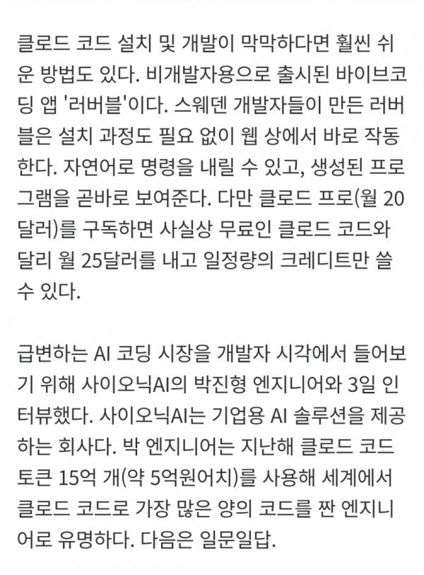 • 비개발자용으로 출시된 바이브코딩 앱 '러버블'과 같이 더 쉬운 AI 코딩 도구도 존재하며, AI 코딩 시장의 급변 속에서 개발자의 역할 변화에 대한 전망을 보여준다.