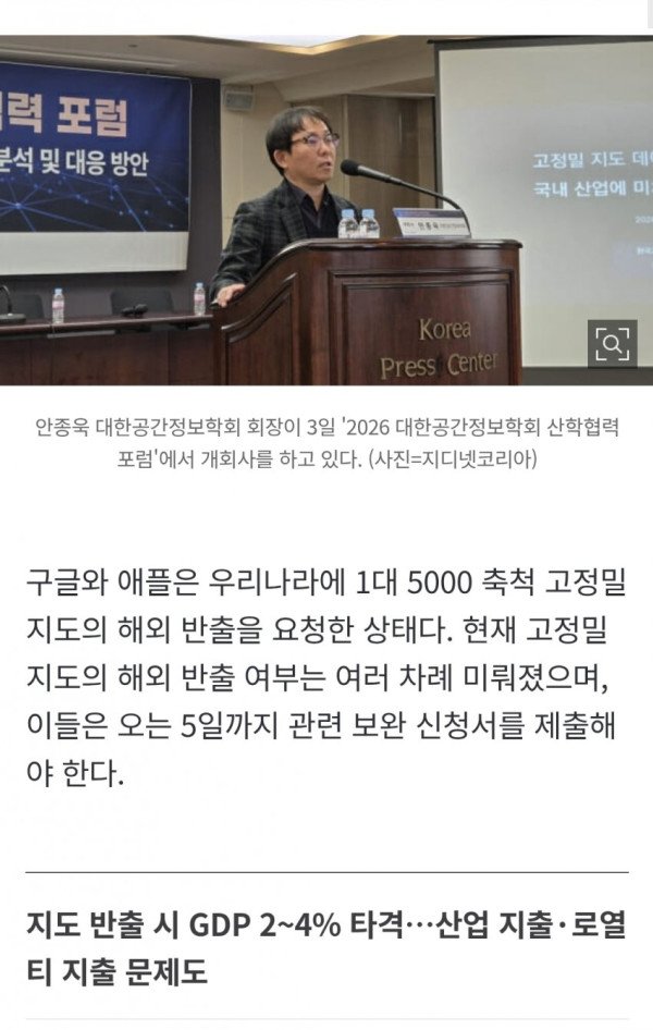 • 대한공간정보학회 포럼에서 구글과 애플에 우리나라 고정밀 지도 1:5000 축척 데이터를 제공할 경우, 향후 10년간 최대 197조 원에 달하는 경제적 피해가 발생할 수 있다는 분석이 제기되었다.