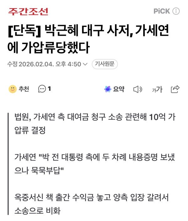 주간조선이 확인한 결정문에 따르면, 지난 1월 30일 서울중앙지방법원은 주식회사 가세연과 김 씨가 박 전 대통령을 상대로 제기한 대여금 청구 소송과 관련해, 박 전 대통령 사저에 대한 부동산 가압류 신청을 인용하는 결정을 내렸다. 이 결정에서 대여금 채권 금액은 총 10억원(김씨 9억원·가세연 1억원)으로 기재됐다.