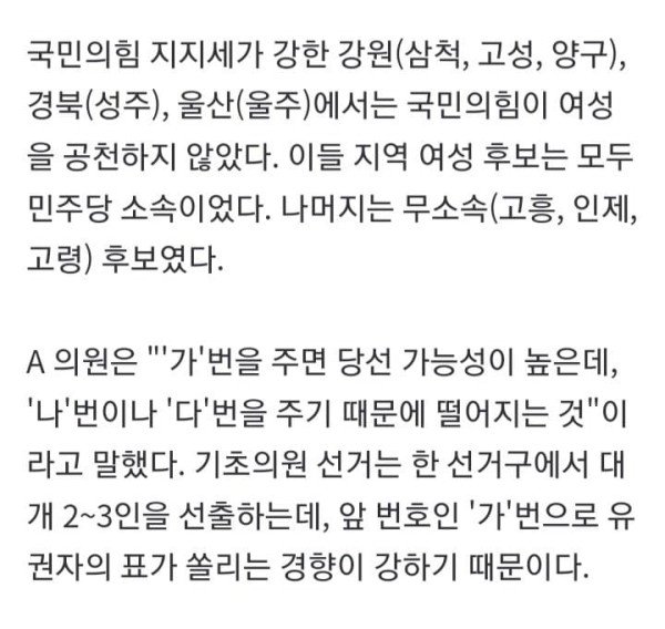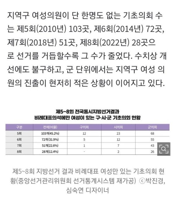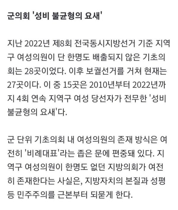 지방자치의 최일선인 기초의회에서조차 여성은 여전히 주변에 머물고 있다. 군 단위 기초의회 가운데 지역구 여성의원이 단 한명도 없는 곳은 현재 27곳에 이른다. 이 가운데 상당수는 기초의회 역사상 여성 지역구 의원을