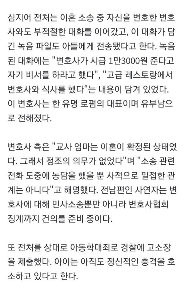 불륜이 발각돼 이혼을 당한 현직 중학교 교사가 자신의 초등학생 아들에게 불륜 사실을 담은 메시지를 전송해 논란이 되고 있다. 3일 SBS '뉴스헌터스'에는 아내가 아이를 방치한 채 다수 남성과 외도해 결혼 11년 만