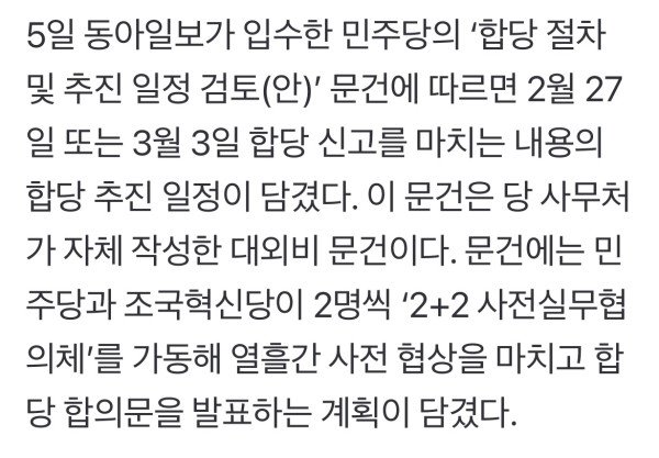 더불어민주당이 조국혁신당과 합당 시 일정과 방식에 대한 대외비 문건을 작성한 것으로 나타났다. 문건에는 조국혁신당 측 인사를 지명직 최고위원으로 지명하는 방안을 검토하는 내용이 담겼다. 사실상 2021년 열린민주당과